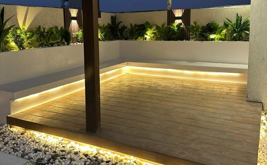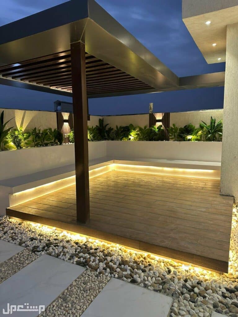 الإضاءة الأرضية، الفوانيس الشمسية، والسبوتات تضيف أجواء ساحرة ليلاً. استخدم إضاءة دافئة لخلق جو مريح، وبيضاء للمناسبات.